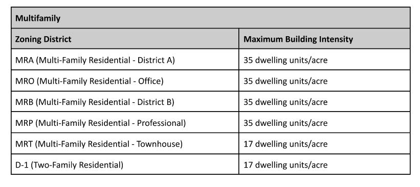 Each parcel in the city is assigned both a Zoning Designation and a “General Plan land use designation”, which, in addition to identifying the context and purpose of each designation, also sets the maximum density for residential land uses. The designations are laid out in the Land Use element of the General Plan. Below is a table summarizing the residential density allowed in each of the city’s current zoning districts.